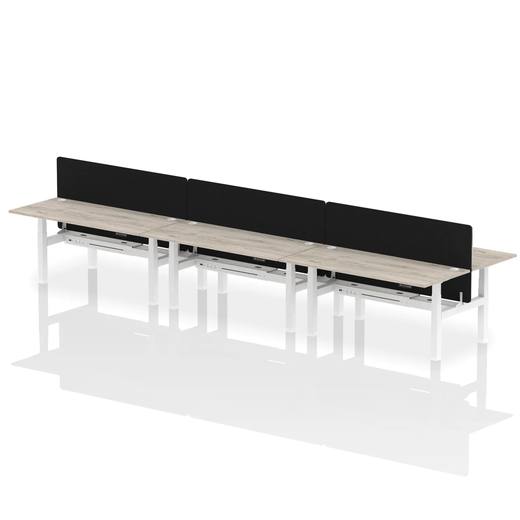Elevate your office with the Air Back-to-Back Height Adjustable Desk for six, a blend of ergonomics and connectivity. Each desk includes two Ethernet ports, a USB and USB-C port, and three UK plugs, complemented by integrated cable ports for a clean setup. The addition of a dividing screen per duo offers privacy and focus. This desk is a perfect match for professionals seeking a tidy, tech-friendly, and adaptable workspace.