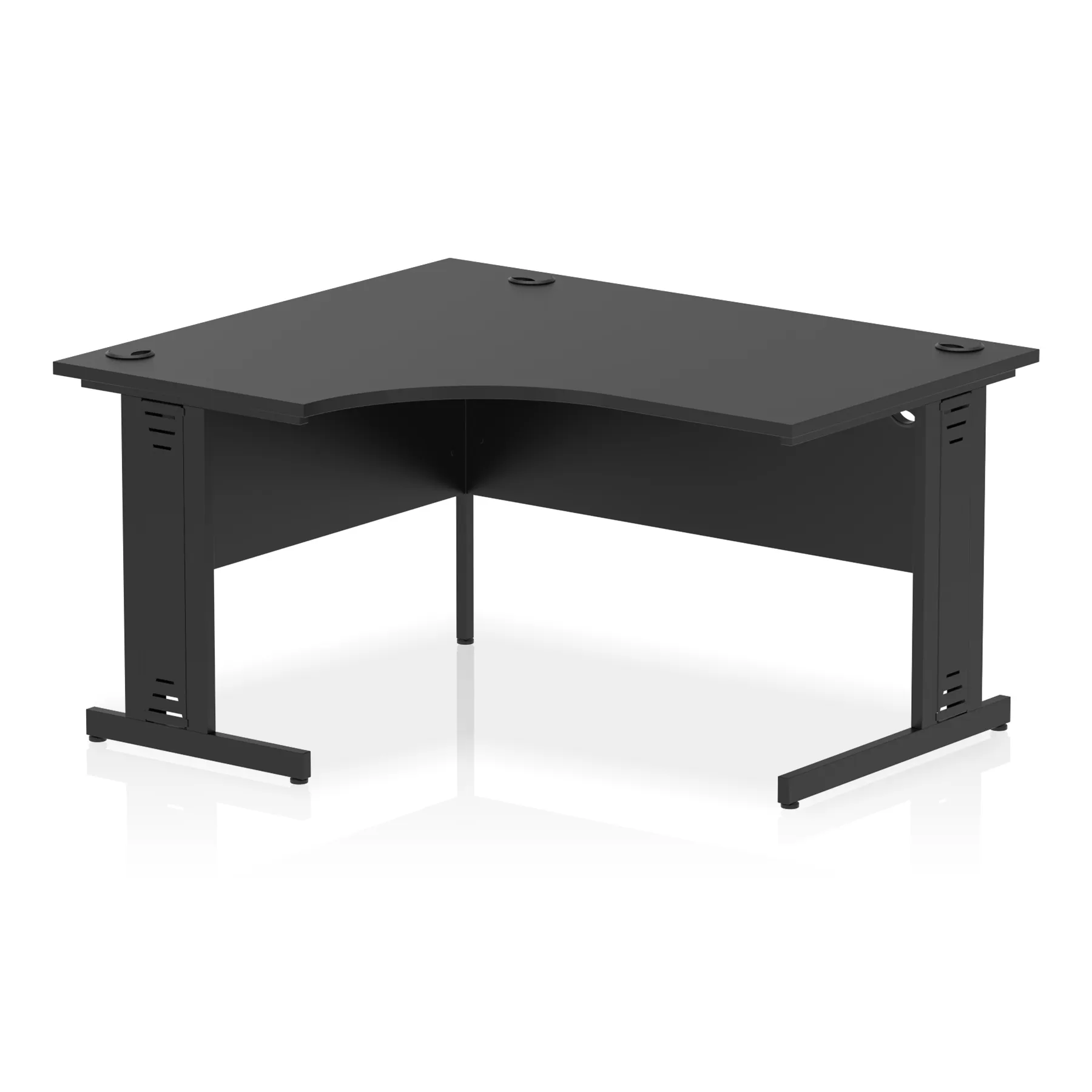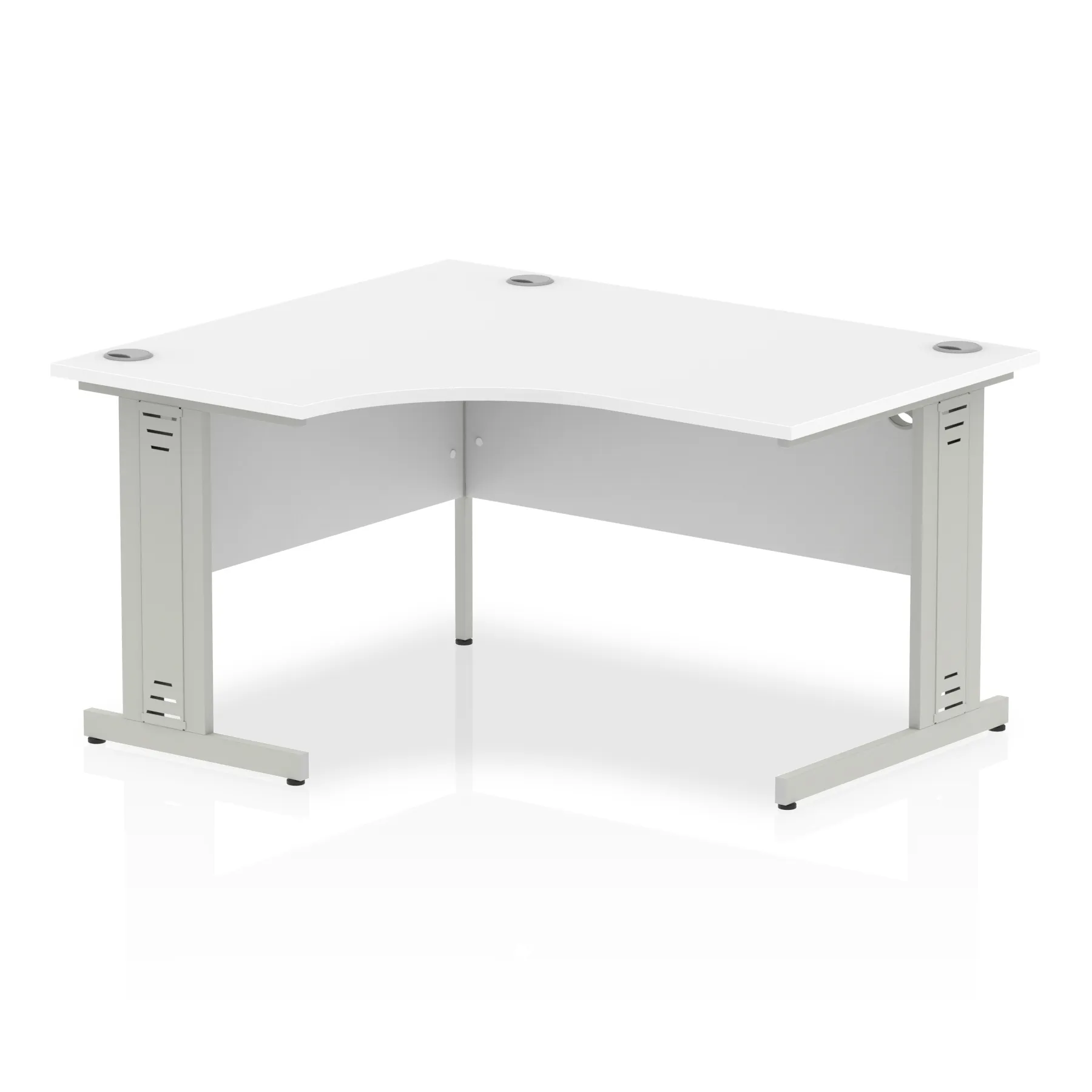 • Impulse contract 1400 wide crescent desk • 25mm tops • Heat resistant melamine finish • 18mm modesty panels • 2mm protective abs edging • Double strut legs • 3 cable ports • Height adjustable feet • Steel to steel fixings • 3 modesty panels slots • 600 deep • Deep set modesty panel (5″) allows for compatibility of most screen clamp fittings • Weight Capacity: 135Kg