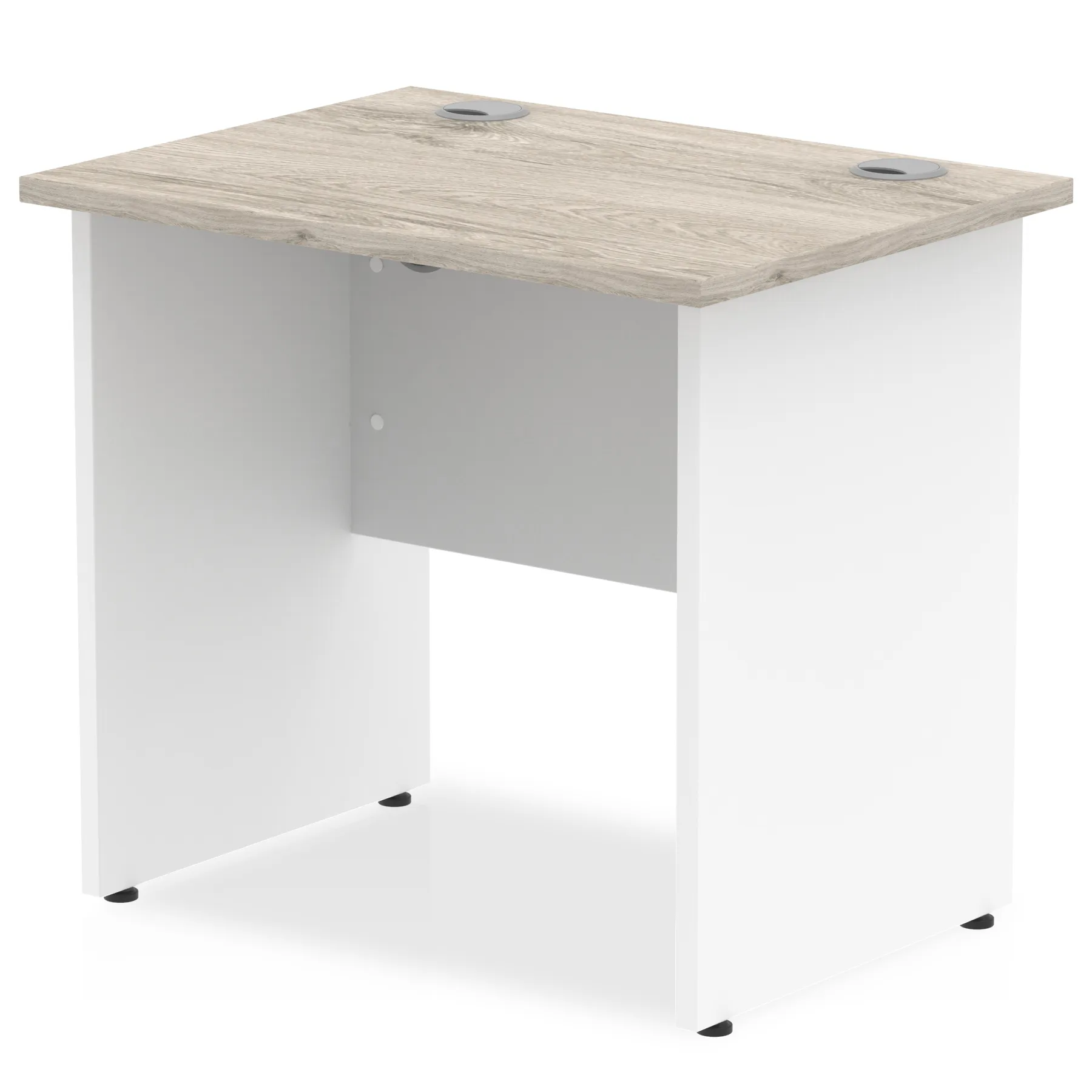 Impulse contract desk | 25mm tops | Heat resistant melamine finish | 18mm modesty panels | 2mm protective abs edging | Panel end legs | 2 cable ports | Height adjustable feet | Steel to steel fixings | 2 modesty panels slots| Deep set modesty panel (5″) allows for compatibility of most screen clamp fittings | Weight Capacity 135Kg