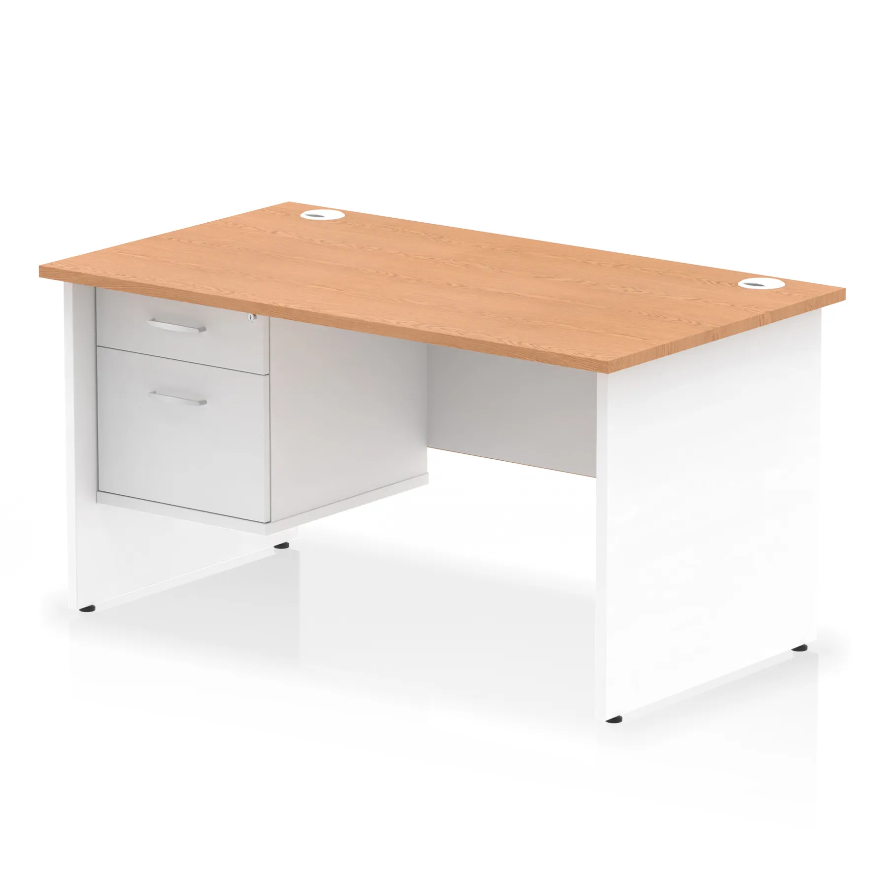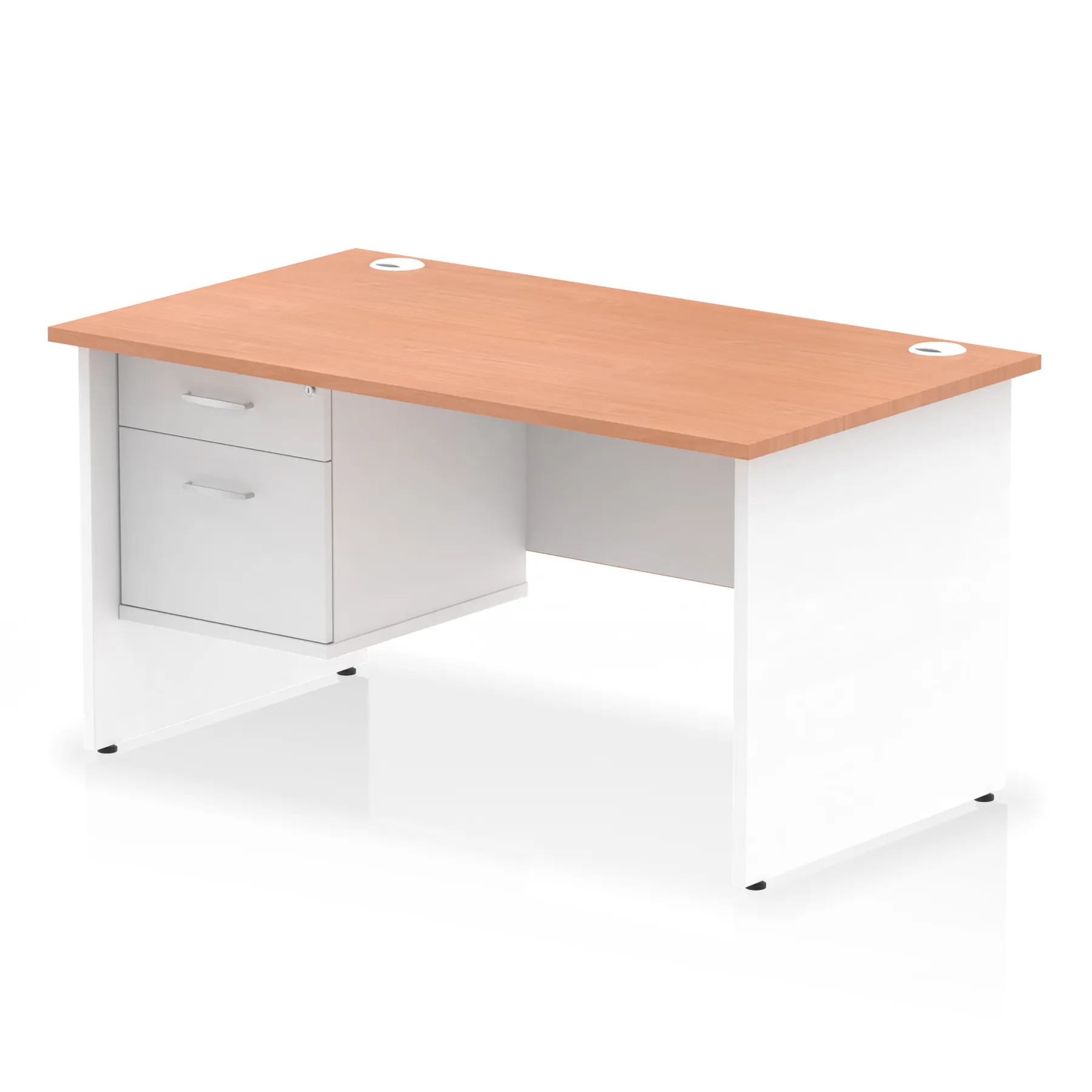 • Impulse contract 1400 wide desk • 25mm tops • Heat resistant beech melamine finish • 18mm modesty panel • 2mm protective abs edging • Matching wood panel end legs • 2 cable ports • Height adjustable feet • Steel to steel fixings • 2 modesty panel slots • Deep set modesty panel (5”) allows for compatibility of most screen clamp fittings • Fixed pedestal