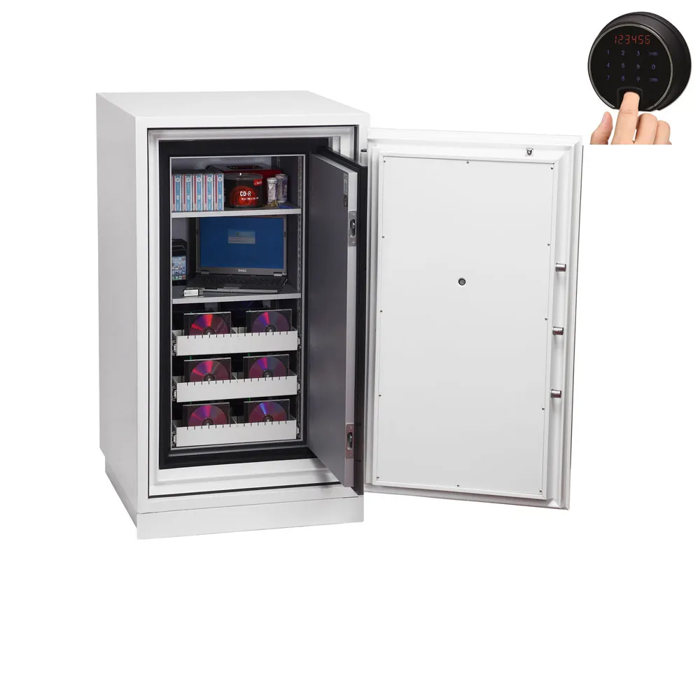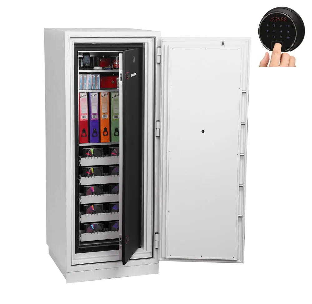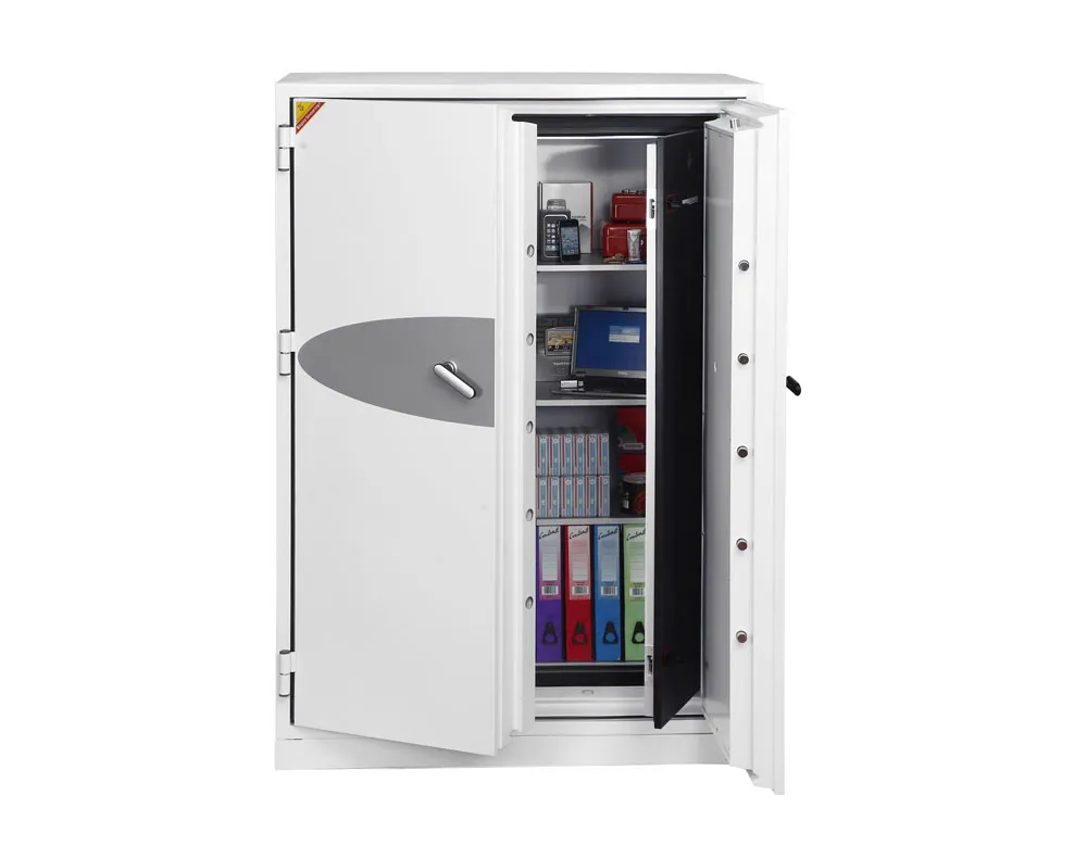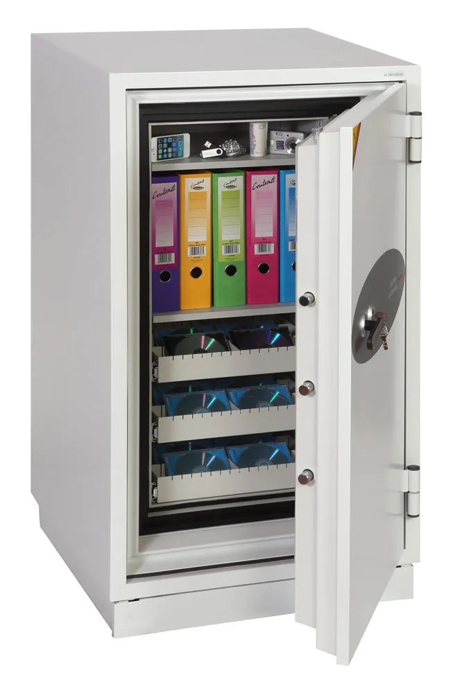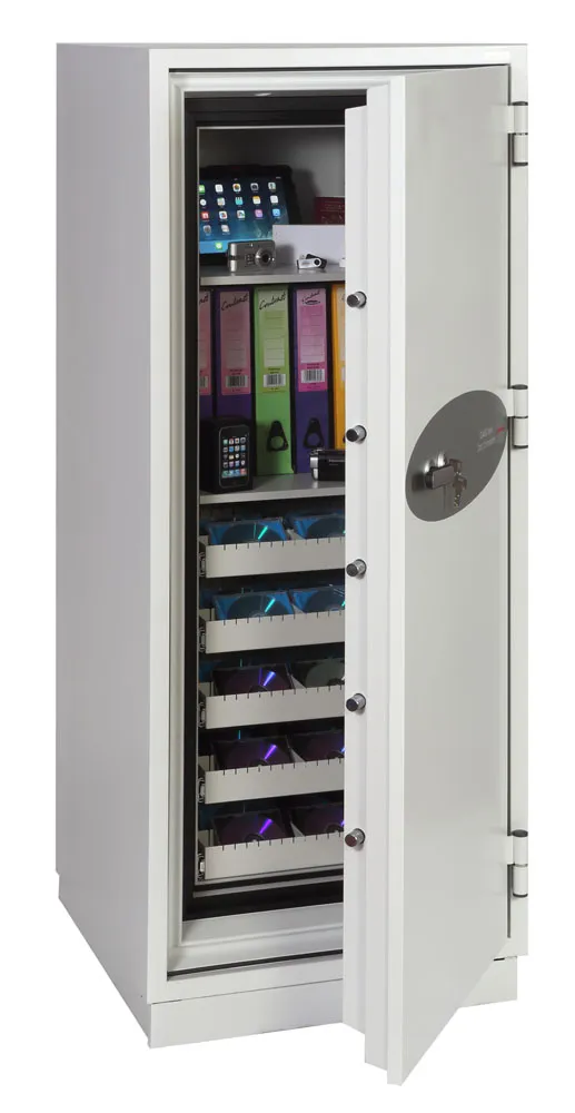 FIRE PROTECTION (DATA) – Tested to Swedish NT Fire 017 – 120dis standard, providing 120 minutes fire protection for computer backup tapes | WATER RESISTANCE – Twin water resistant seals provide an airtight water resistant inner compartment for your computer media | SECURITY PROTECTION – Recommended for an overnight cash risk of £2,500.00 or £25,000.00 valuables | DROP TEST – Fire and impact tested from 9.1 metres for resistance to the impact of falling through the burning floors of a building | SPECIAL FEATURES – Fitted with automatic slam shut locking | FITTINGS – Each unit comes complete with 2 height adjustable shelves and 3 pull out media trays | COLOUR – Finished in a high quality scratch resistant paint RAL9003 White
